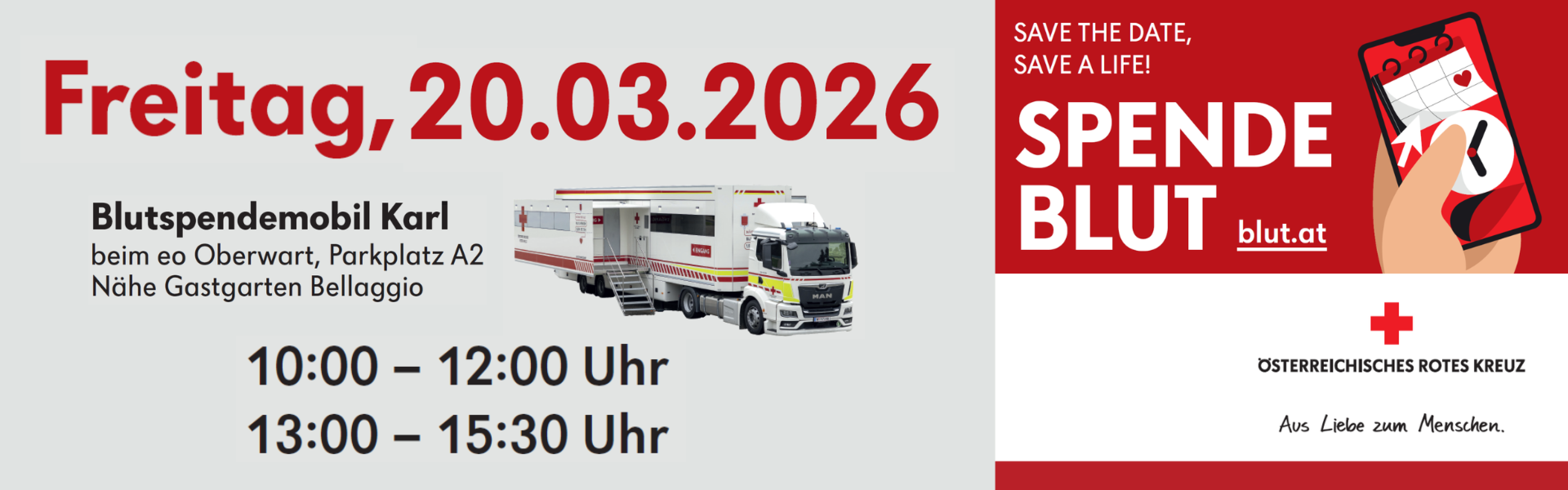 Am 20. März kommt das Blutspendemobil KARL wieder ins eo. Von 10-12 sowie von 13-15:30 Uhr haben Sie die Möglichkeit, Blut zu spenden.